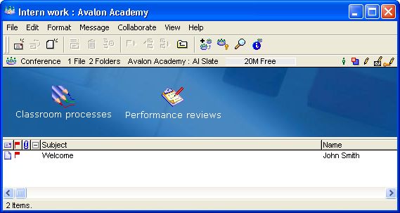 To make sure Al has all the information he needs to learn about the class and to track his progress, John creates a new conference on his FirstClass Desktop called Intern Work and adds the following containers to the conference:
