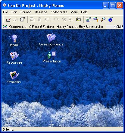 Within the main conference, called Can Do Project, there are five containers to store the various components of the project. This conference will be shared with other members of the project team.