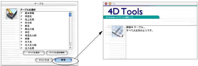 ●何らかの原因でデータが破損してしまった場合に、4DToolsの「検査と修復」を使用して修復できる場合があります。「検査と修復」前には必ずデータ部分のコピーをとってください。また、「検査と修復」は目的のデータのサイズ以上のハードディスクの空きがあることを確認した上で、行なってください。