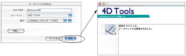 2.「データファイルを作成…」ダイアログが表示されます。自動的に販売プログラムの名称の文字をつけたデータの名前を表示しますが、これを「販売青山商事data-修復」(Windows:「Hs_青山商事修復.4DD」等簡潔な名称に変更します。(「.4DR」は自動的に作成されます))「保存」ボタンをクリックすると、修復が始まります。