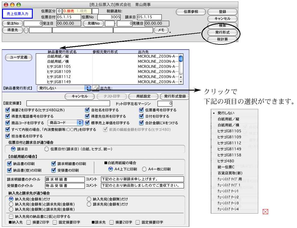 売上伝票入力→「発行形式」設定→「登録」ボタンをクリック→発行(印刷)