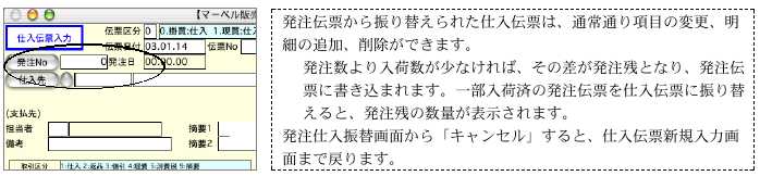 ●発注伝票が入力されている場合、発注Noにより発注伝票を呼び出し、必要に応じて内容を変更し、仕入伝票として登録することができます。