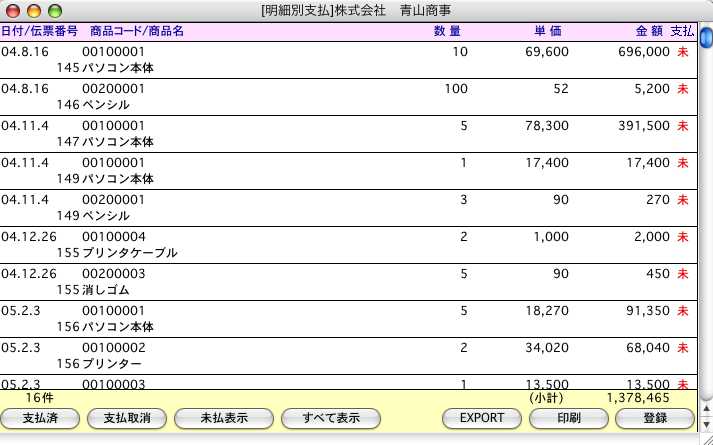 一旦、支払済にしたものを、もう一度未支払に戻したい時は、明細をクリックした後、「支払取消」処理ボタンをクリックします。