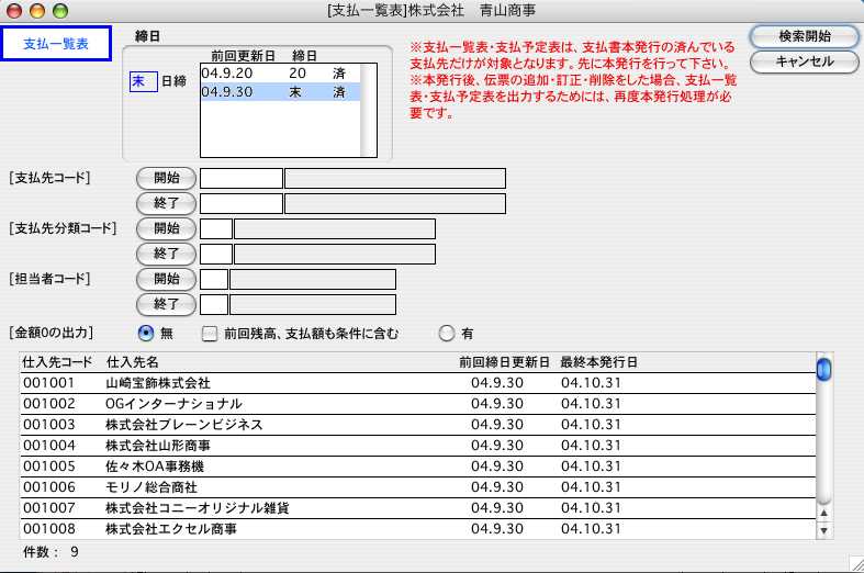 支払一覧表に表示されるのは、締日メニューで『本発行』を行った仕入先だけです。しかし、本発行処理以降にその支払明細書の内容に関する伝票訂正を行った場合、そのままでは支払一覧表に表示されません。必ず支払明細書『本発行』処理をもう一度行ってください。