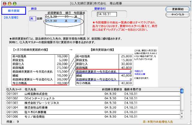 ●締日処理の最後の処理です。(同一締日の)次回の支払明細書『本発行』までに行ってください。(つまり、『03.01.20』の締日更新は、『03.02.20』の支払明細書本発行までに行ないます)