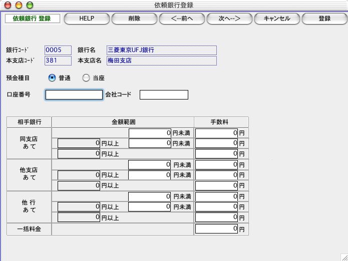 会社の取引銀行で、社員の給与や賞与の振込手続きをする銀行の、口座番号や、手数料の登録を行ないます。銀行本支店登録で、依頼欄にチェックしてある銀行だけが対象(=依頼銀行)になりますので、先に銀行本支店登録を行なってください。