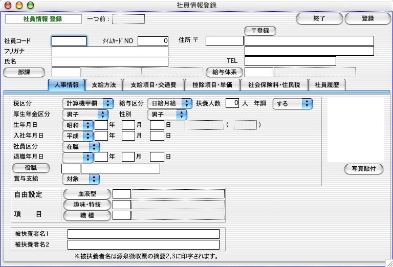 社員のコードや名前、住所、生年月日、支給方法、社会保険の等級等、社員に関する情報を登録します。役職、自由設定項目、住民税納付先、銀行、依頼銀行等は、社員情報の前に登録してくだい。