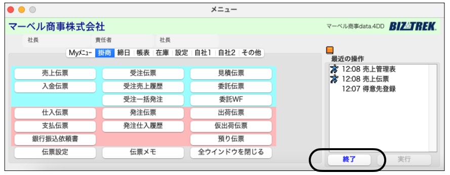 ●メニュー画面の画面右下の「終了」ボタンクリックで、BIZTREKデータを終了します。
