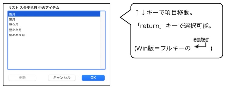 ●主にマスタ設定の画面や、帳表出力条件設定の画面で、項目選択ダイアログが現われる項目があります。