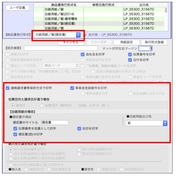 *「売上伝票」では、発行形式を「白紙用紙/縦(領収書)」に変更した時点で領収書用のオプション表示に切り替