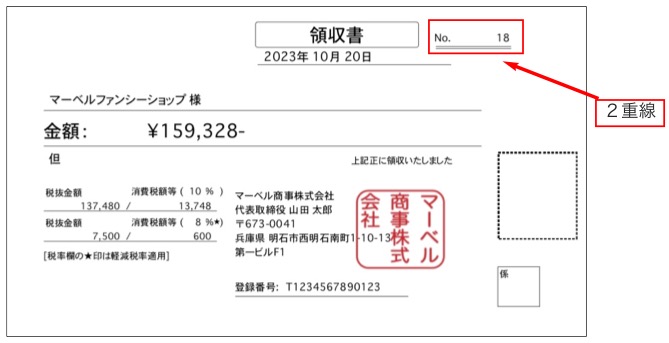 領収書の伝票番号印字の罫線で、どちらの伝票から発行した領収書かの区別が行えます。