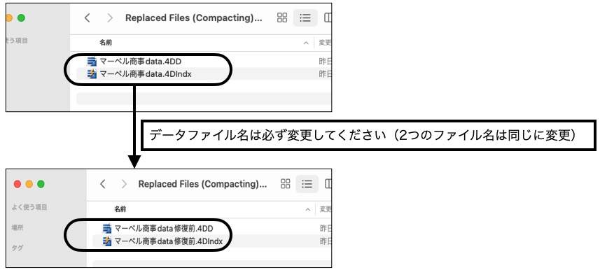圧縮・修復前のデータですので、データ名を必ず変更し、圧縮・修復されたデータが正常に動作をする事を確認後は、必要がない場合は削除します。