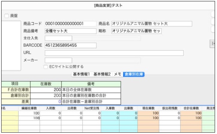 1.各商品マスタの倉庫別在庫に登録した倉庫がセットされた状態であるか確認します。