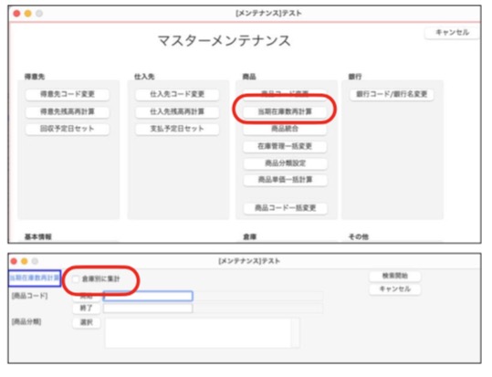 「その他」メニュー⇒「データメンテ」⇒「マスターメンテナンス」⇒「当期在庫数再計算」で全体倉庫及び倉庫別の2回メンテを行います。