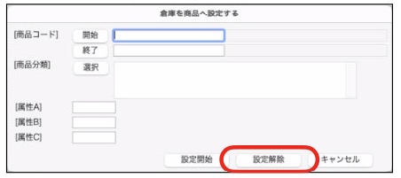 「倉庫変更」画面から「倉庫設定」ボタンをクリックし、在庫数をクリアしたい商品を選択した後、「設定解除」 ボタンをクリックします。