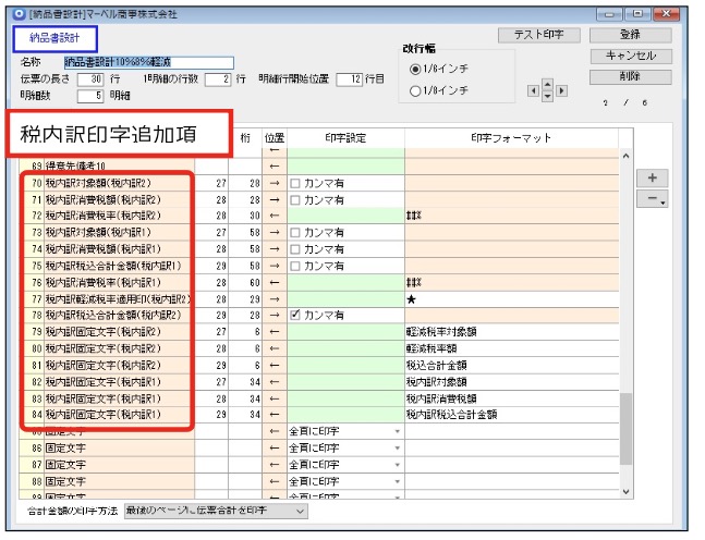 例えば、納品書設計にて「税内訳1」(標準税率10%)、税内訳2(軽減8%*)の設定を定義し伝票の空いた箇所に、横並びに設計した場合、