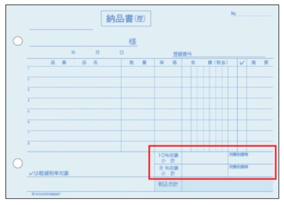 (以下は 印字例の為の伝票) 既に税率枠が印字されており、対象額と消費税額の決められた位置に印字指定が必要です。