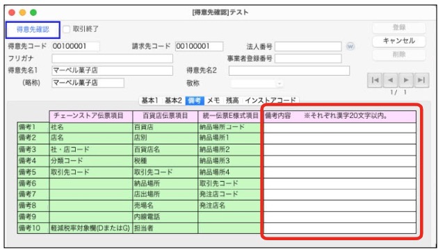 ●「得意先備考1」~「得意先備考10」:得意先マスタにある「備考」の印字設定を行う 箇所です。