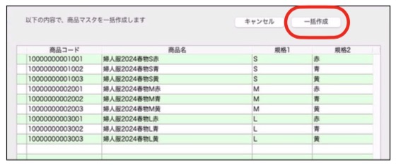 「商品マスタ一括作成」 ボタンは、商品規格を設定し、複数の商品規格パターンのマスタを一括で作成する事ができます。