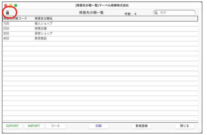 登録済みの得意先分類マスタを修正する場合は得意先分類一覧画面の左上鍵マーク をクリックし 解除します。