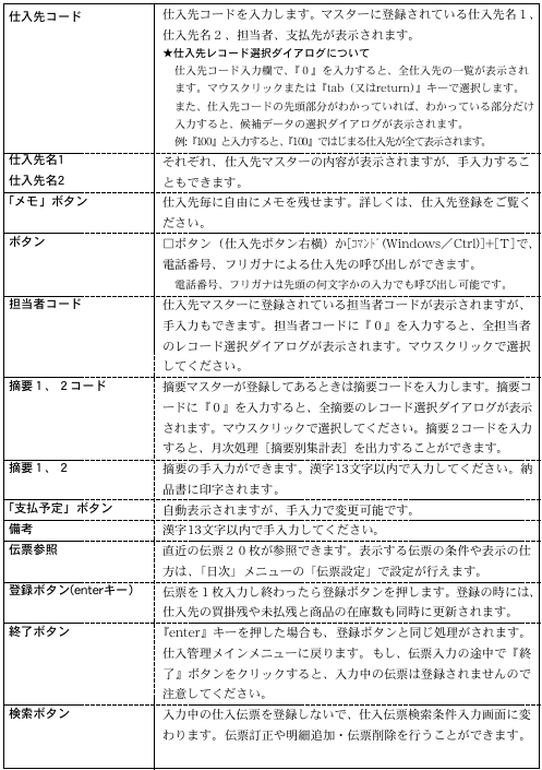 ●明細行一行分を一画面に表示します。これを『仕入明細入力画面』といいます。この画面には、前述の『仕入明細入力1』では処理できなかったいくつかの機能が追加されています。ここでは、その 追加機能の説明をします。その他の項目については『仕入明細入力1』と全く同じです。
