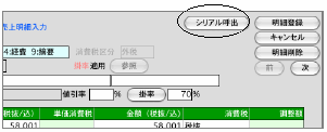 ●「売上明細入力」画面で、取引区分、商品コードを入力後「シリアル呼出」ボタンをクリックすると、シリアル番号一覧画面に移ります。一覧から、今回売上げるシリアルNoをダブルクリックすると、売上に関する情報が自動入力され表示されます。内容を確認後登録してください。一覧画面から「伝票書込」ボタンをクリックすると、伝票明細商品名備考欄にシリアルNoが自動入力されます。売上伝票の得意先が未入力の場合は、ここで手入力できます。「得意先」をクリックすると、得意先マスターレコード選択ダイアログが表示されます。尚、売上側からは仕入に関する項目は入力できません。