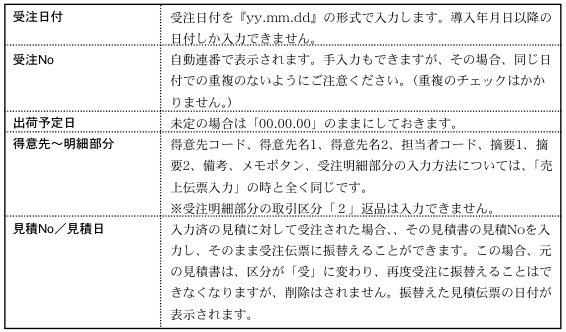 ●受注伝票の入力/訂正、受注票の発行、受注明細表の出力を行ないます。受注残の管理や受注票の発行が必要なければ、この処理は省略できます。