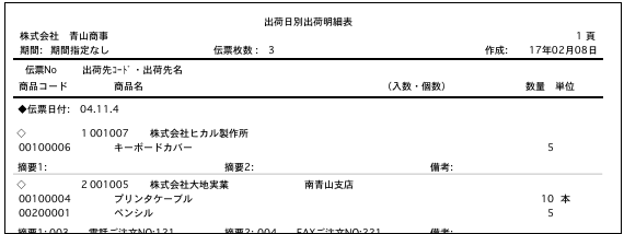 出荷日別/出荷先別/商品別の明細表を、A4白紙単票用紙に印刷します。
