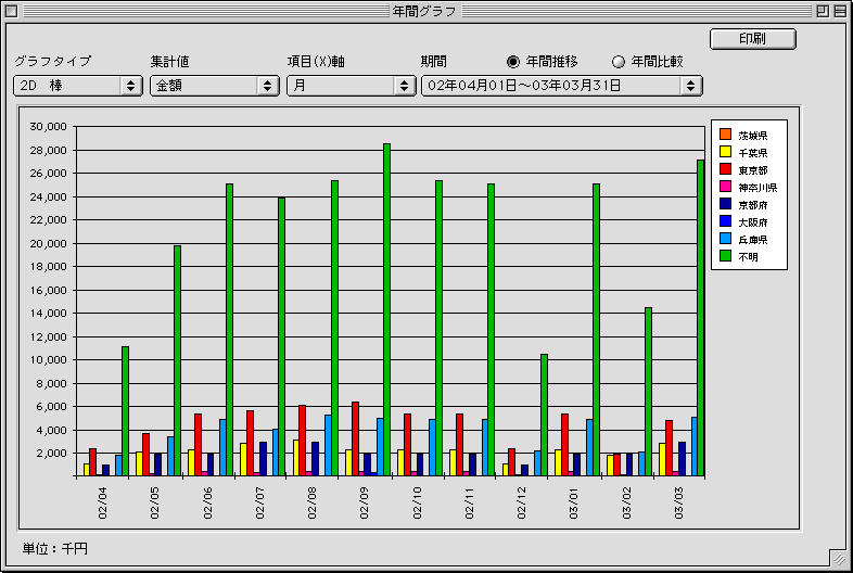 ・期間 集計期間が2年以上の場合、グラフにする期間(各年または全期間)を選択