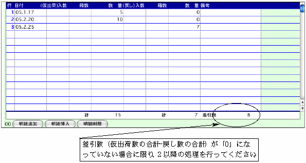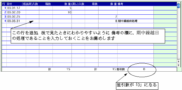 (3)続けて次の行に、期中繰越日の翌日の日付で、先程戻した数と同数を仮出荷数の欄に入力します。この例ですと、期末の戻し数「8」を[2003.4.1]の日付で仮出荷し、差引数を再び「8」にしています。