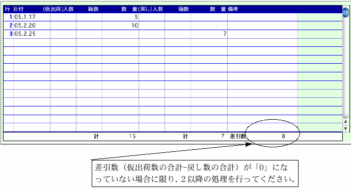 (2)このように、期末において、仮出荷の差引数が「0」になっていない場合、[期末日付]で、差引数をいったん戻し、期末における差引残を「0」にする処理を行ないます。この例ですと、差引数の「8」を[2005.3.31]の日付で戻し、差引数を「0」にしています。