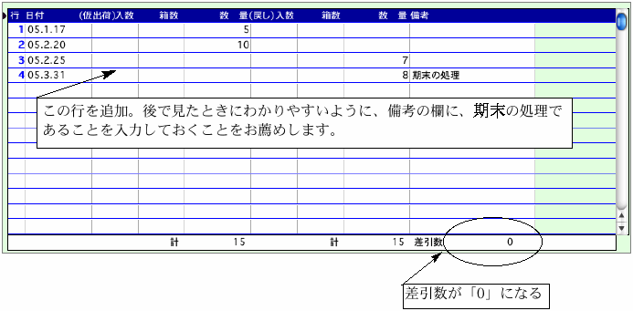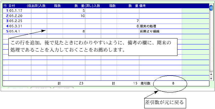 (3)続けて次の行に、期末の翌日の日付で、先程戻した数と同数を仮出荷数の欄に入力します。この例ですと、期末の戻し数「8」を[2003.4.1]の日付で仮出荷し、差引数を再び「8」にしています。