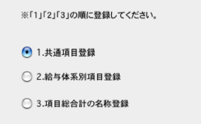 ※先に、必ず「1」を選択してください。登録が終わると、また、この画面に戻ってきますので、今度は「2」を選択します。(給与体系別手当が一つもない場合は「2」は省略できます。)