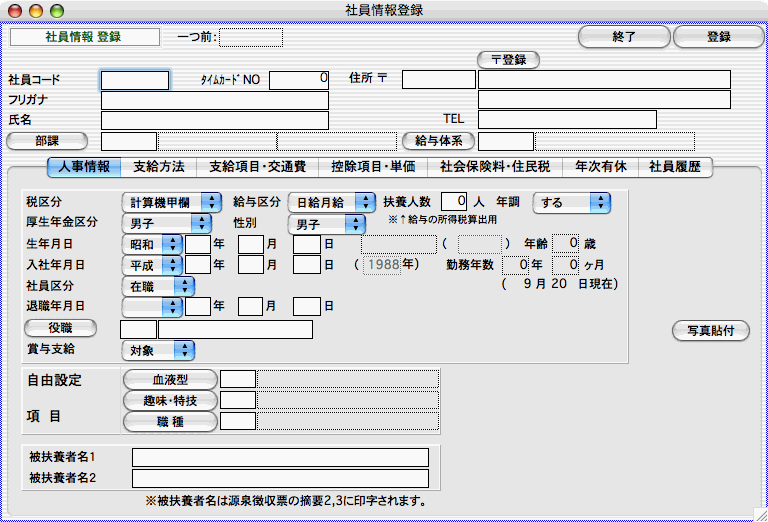 社員のコードや名前、住所、生年月日、支給方法、社会保険の等級等、社員に関する情報を登録します。役職、自由設定項目、住民税納付先、銀行、依頼銀行等は、社員情報の前に登録してくだい。