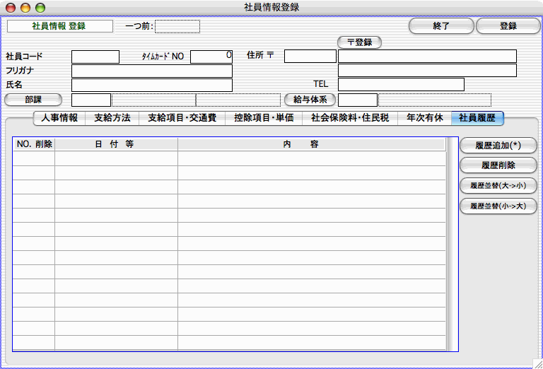 社員履歴は、社員の履歴や、これからの予定等、給与計算・人事管理に関する情報を登録できる汎用的な項目です。