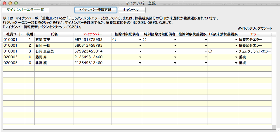 エラーが検出された場合、この画面で訂正して、「マイナンバー情報更新」ボタンをクリックして保存します。再びエラーチェックが行われ、エラーが無くなるまで繰り返します。