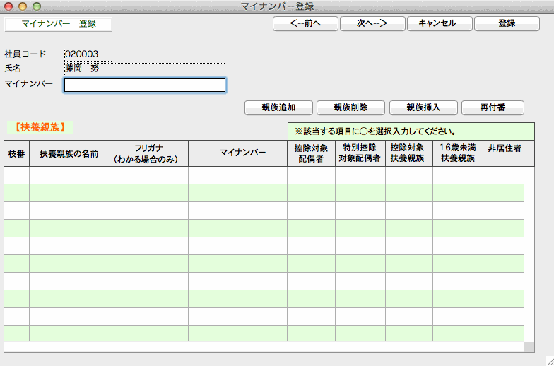 社員のマイナンバーや、扶養親族の名前やマイナンバー、扶養区分等を登録します。