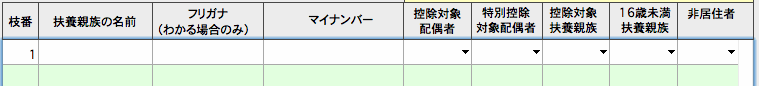 1.1行目(枝番[1])の入力ができるようになります。「扶養親族の名前」「フリガナ」「マイナンバー」を入力します。