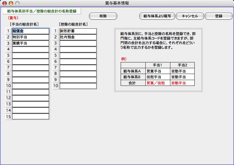 ※給与体系別に15の賞与手当名称と10の賞与控除名称を登録できますが、給与体系間で、それぞれを合計する時の名称をここで登録します。(同一番号の手当や控除の金額が合計されます。)