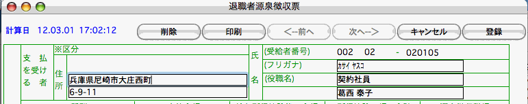 「退職者源泉徴収票」に表示されている金額が、正しくない場合は、退職者源泉徴収票画面の「削除」ボタンでいったん削除してから、メニューに戻り、再度「退職者源泉徴収票」を出してください。(退職者に関するデータの入力が不完全な状態で「退職者源泉徴収票」を作成すると、不完全な帳表が作成されてしまいます。この場合、いったん削除して再度作成すると、再計算されます。)