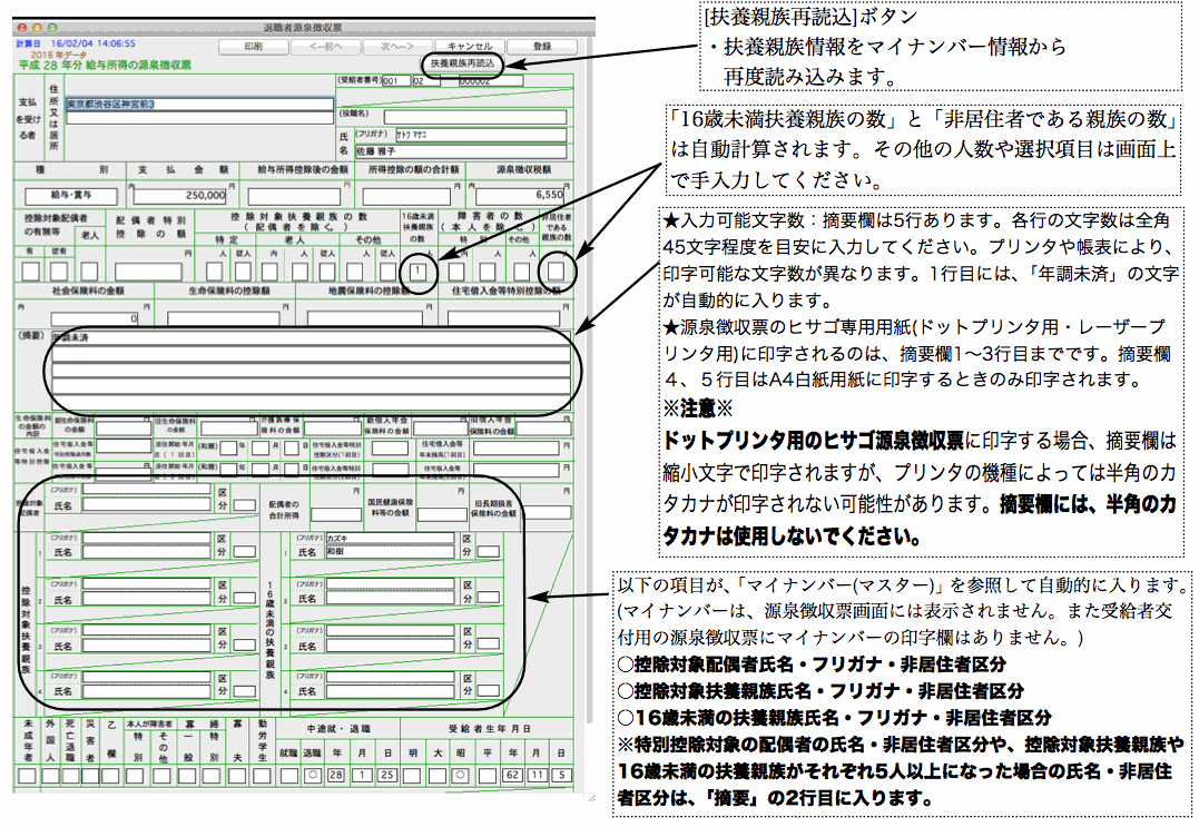 摘要欄等に手入力をする必要があれば、ここで入力することができます。扶養親族の人数等も手入力してください。