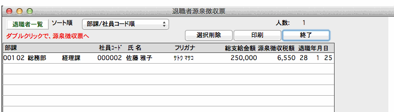 一覧からダブルクリックすると、その社員の退職者源泉徴収票が画面に表示されます。