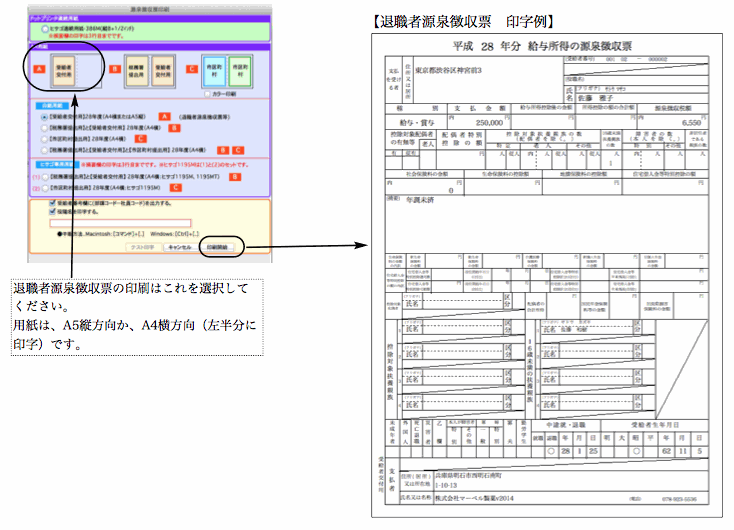 印刷ボタンをクリックすると、用紙の選択画面が現われます。どれか選択して、印刷開始ボタンをクリックします。ヒサゴ連続用紙に印字する場合、テスト印字ができますので、用紙の位置合わせを行ってください。A4白紙用紙に印刷する場合、次に表示される用紙設定ダイアログで横方向を選んでください。A4用紙を2分割して源泉徴収票が印刷されます。