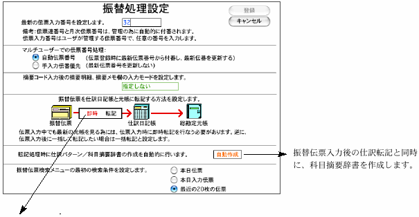 1.即時転記.....伝票の登録をする度に元帳への転記をします。(伝票入力中でも最新の元帳を見ることができます)