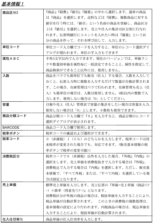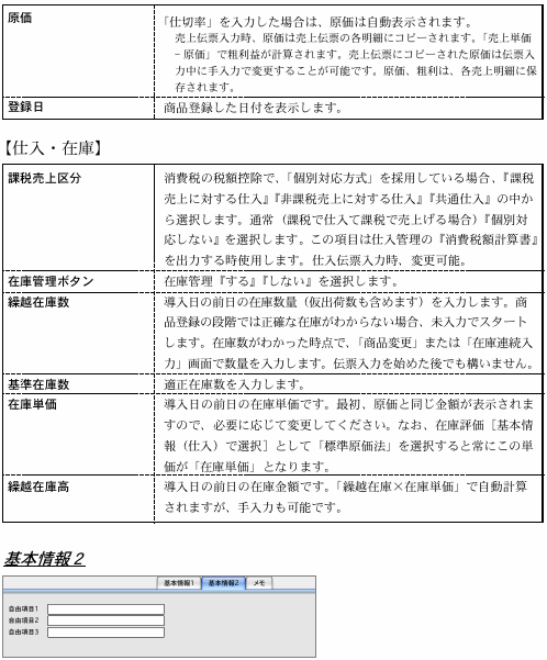 ●最新の在庫状況を確認できます。繰越在庫、基準在庫数、在庫単価、繰越在庫高は手入力できます。それぞれの項目については、商品登録画面の説明を参照してください。