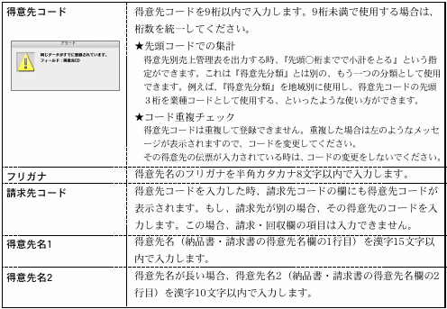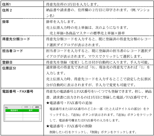 ※売上伝票を入力後、税額通知を変更しないでください。消費税の計算が正しくなくなります。もし、「納品書毎」→「請求書毎」などに変更した場合は、請求書本発行、締日更新が済んでから変更します。尚、月間中に変更した場合、入力済みの伝票を一枚づつ呼び出し、得意先コードの再入力をし、伝票の再登録をしてください。 得意先マスター登録後は、安全の為、『その他』処理の『得意先チェック』を行なってください。