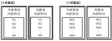 例えば当座預金の内訳科目は5つ、売掛金の内訳科目が100ある場合、当座預金の内訳コードは「001」と設定します。内訳コードを1桁しか登録しない時、01,02,03......の様に前に0を入れ2桁で登録します。