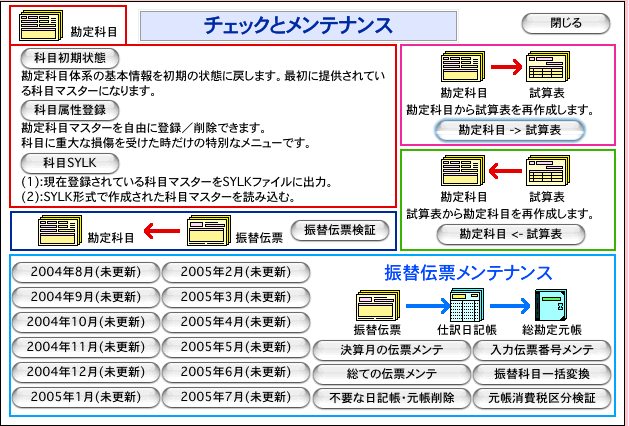[チェックとメンテナンス]→[科目SYLK]ボタン→1)[科目SYLK出力](表計算ソフトにExport) 又は、2)[科目SYLK読込](データのImport)ボタンをクリックの操作だけで、科目データのやりとりができます。