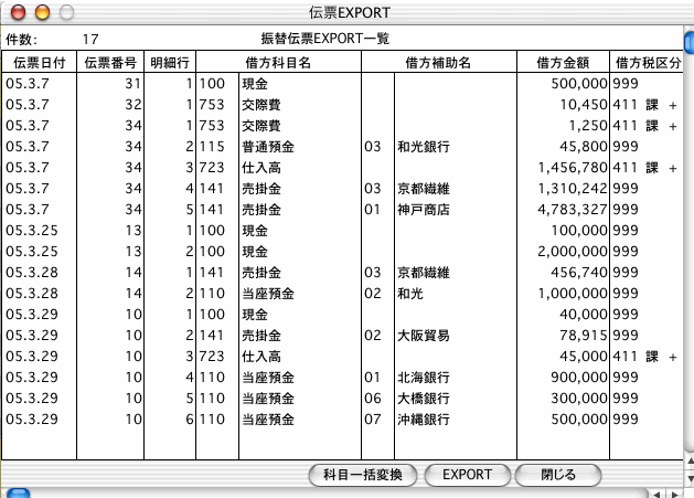 もし、EXPORTするファイルの科目コードを変更したい場合、「科目一括変換」の処理をします。
