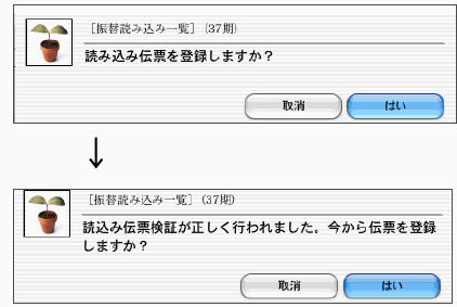 7.「はい」ボタンで、仕訳の内容をチェック、問題なければ、伝票の読込→仕訳転記の作業を実行します。